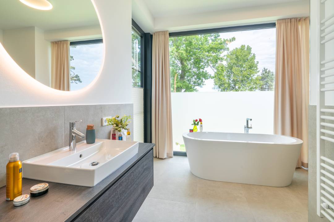 - 2 voll ausgestattete Bäder mit begehbarer Dusche und einer Badewanne + Gäste-WC